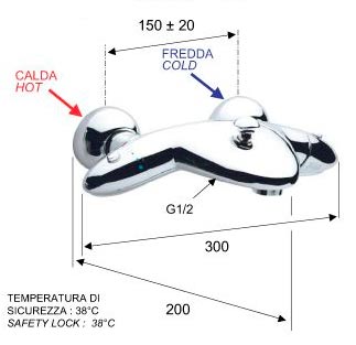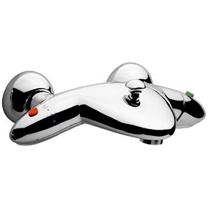 Смеситель для ванны и душа настенный с кнопкой безопасности, фиксирующей температуру воды на 38°, душем не укомплектован.