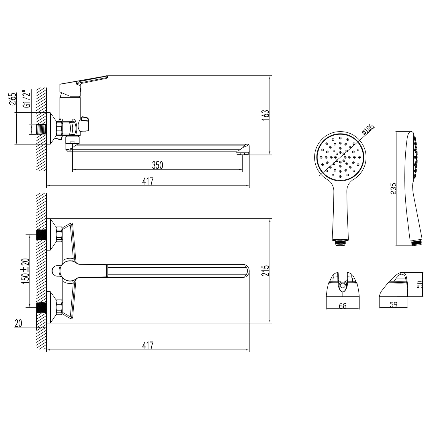 Оснащение: аэратор, душевая лейка,душевой шланг,держатель для душевой лейки, комплект отражателей,эксцентрики