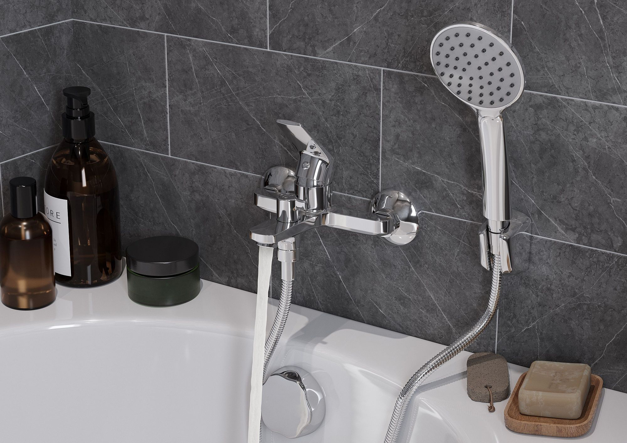 Оснащение: аэратор, держатель для душевой лейки, дивертор, душевая лейка, душевой шланг, смеситель, эксцентрики