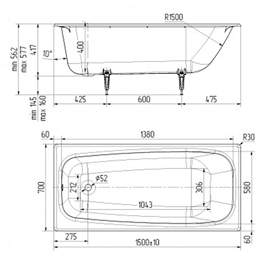 - высота ванны на ножках - 570 мм.