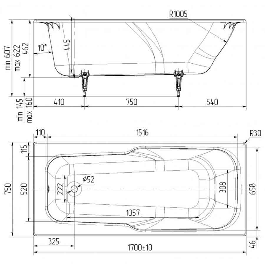 Ванна переменной ширины . У слива - 56 см., место для сидения - 66 см.