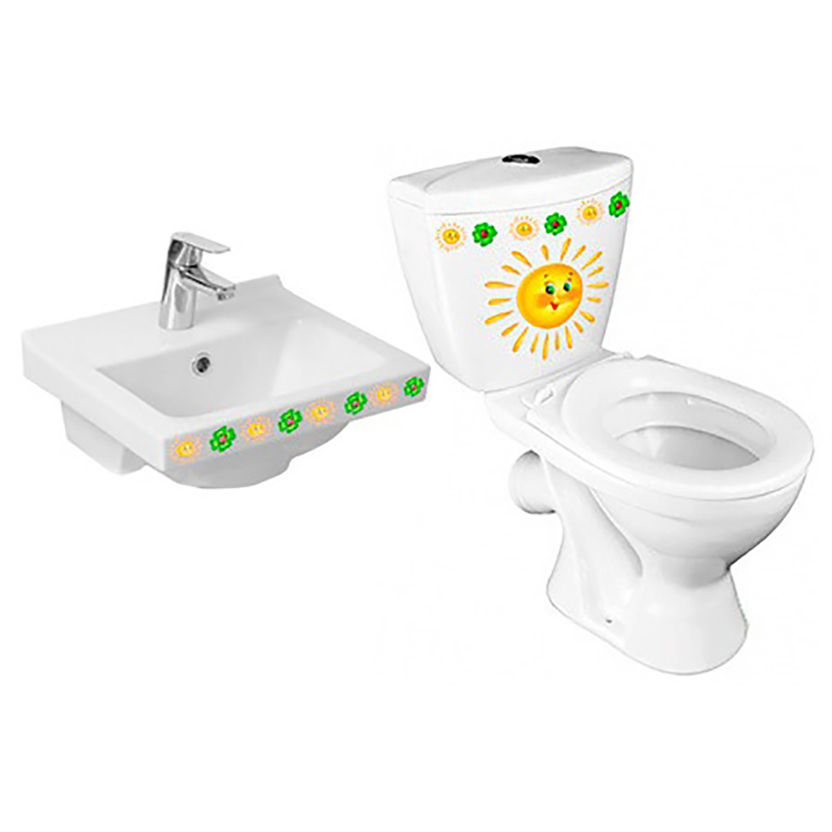Унитаз-компакт СОЛНЫШКО детский создан с учетом возрастных особенностей детей дошкольного и младшего школьного возраста, высота чаши всего 345мм, чаша воронкообразная, способ монтажа напольный на два болта, выпуск косой под 45 градусов, сиденье детское полипропиленовое.Унитаз детский с раковиной СОЛНЫШКО.